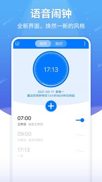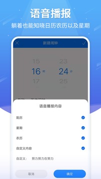 这是一款智能语音闹钟。简单实用,准时闹起,语音为您播报日期、农历、星期等信息,还可以自定义播报内容,来个每日一句给自己加油吧!